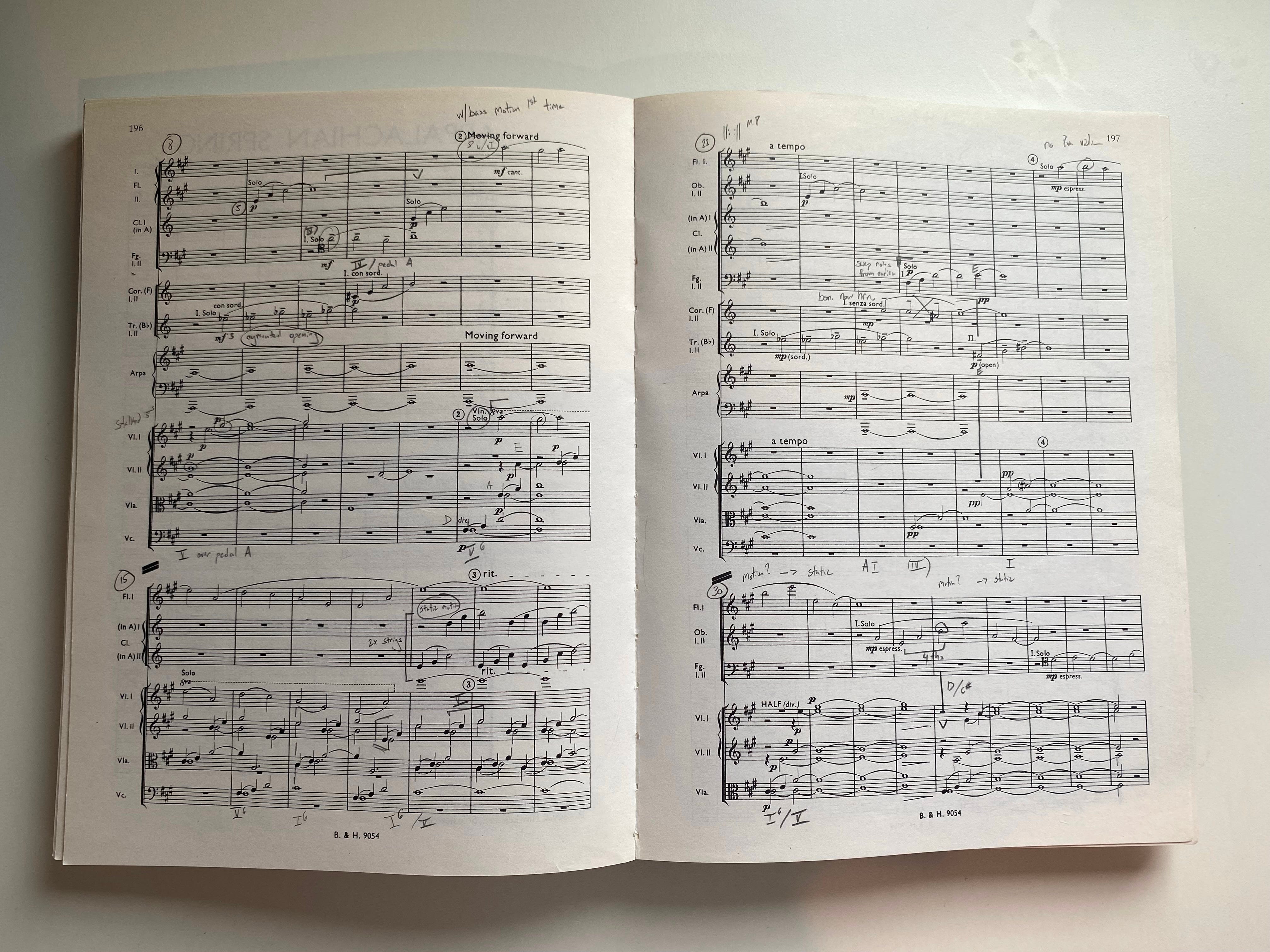 I will also come up with abbreviations and symbols that mean something to me, but would be complete wingdings to someone else. For instance, it takes a lot to convince me that a “new motive” in a piece is truly new and not just a transformation of a previous motive. Because of that, I don’t usually label motives as “A” or “B” but rather with some combination of Roman numerals and decimals: “I.1, I.2, I.3, II.1.” Other times I will use colored pencils when the music has several motive streams operating at once or when rhytmic units repeat and transform over time. I’ll often put “$$$” next to especially good timbres or “???” next to passages that seem—and sound after investigating multiple recordings—poorly written for the instrument.